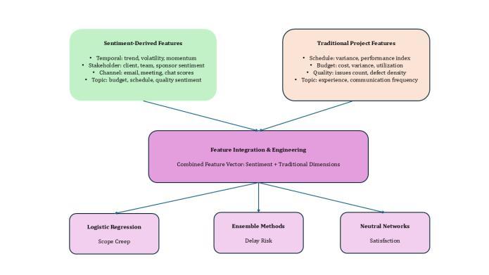 The framework employs a comprehensive feature engineering approach that combines sentiment-derived featureswithtraditionalprojectmetrics: