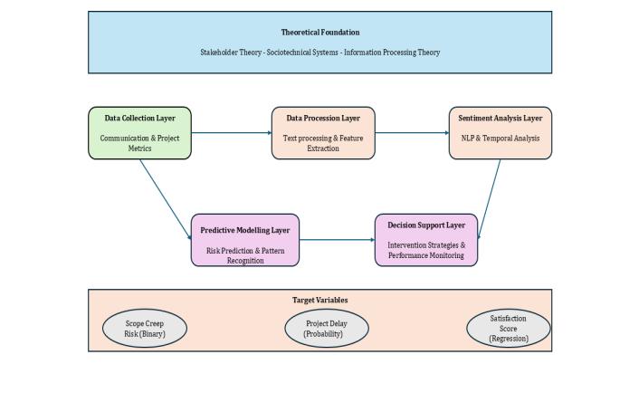 The framework's multi-layered architecture provides a structuredapproachtodatacollection,processing,analysis, prediction, and decision support. The focus on three key targetvariables scopecreeprisk,projectdelaylikelihood, and stakeholder satisfaction addresses fundamental projectmanagementchallengeswhilemaintainingpractical applicability.