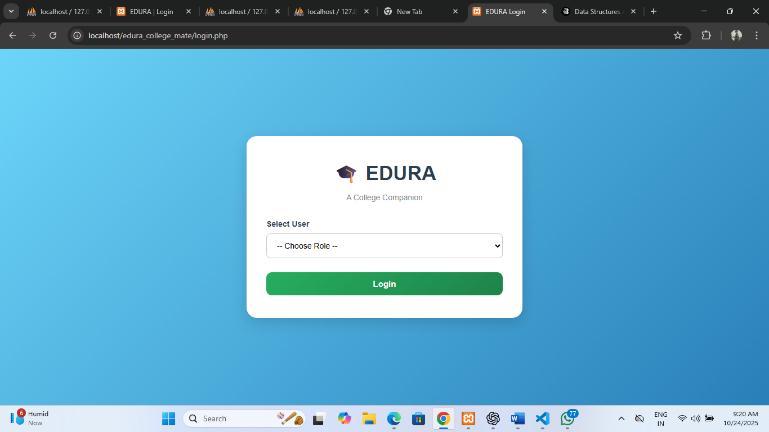 Abstract - This project presents EDURA, a web-based college companion platform developed using PHP, HTML, CSS, JavaScript, and Microsoft SQL Server, designed to centralize and manage academic activities for students and faculty. Using features such as timetables, study materials, examschedules,eventnotifications,andquerymanagement, the system aims to streamline college workflows and improvecommunication.Various modules, includingstudent dashboards, faculty dashboards, and administrative panels, were implemented to ensure role-based access and functionality. The system also incorporates database management, dynamic content rendering, and user authentication mechanisms to enhance usability and data security. The platform’s performance and reliability were assessed through testing of module interactions, data retrieval, and real-time notifications. Additionally, a userfriendly web interface was developed to allow students and faculty to access and manage academic information efficiently.Thissystemaimstoserveasacomprehensivetool for organizing, tracking, and facilitating academic activities in colleges, with potential applications in improving productivity, resource management, and student-faculty engagement.