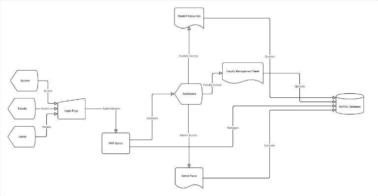 A centralized PHP-based Web Server connected to SQL Server handles all backend operations such as authentication, data retrieval, and management of dashboardsforstudents,faculty,andadministrators.