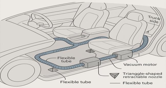 Keywords: Inbuilt car vacuum cleaner, automotive cleaning system, integrated vehicle features, on-board vacuum concept, interior maintenance, compact suction system, automotive convenience, power-efficient design, filtration system, dashboard-controlled cleaning, vehicle hygiene, innovative car features.