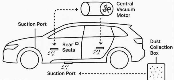 Theinbuiltcarvacuumcleanersystemfunctionsthrougha centralized suction arrangement permanently integrated within the vehicle. The main unit, known as the Central SuctionModule(CSM),ismountedbeneaththerearseator insidethetrunkcompartmenttosavecabinspaceandensure accessibility for maintenance. The module consists of a brushless DC (BLDC) motor coupled with a centrifugal blower,acyclone-typedustseparator,a HEPAfilter,anda removabledustcollectioncanister.Aseriesofflexibleducts connect the suction module to multiple intake ports positioned at critical areas such as the front and rear footwells,under-seatzones,andtheluggagecompartment. When the user activates the vacuum function through a switchortouchcontrolonthedashboard,theBLDCmotor startsrotatingathighspeed,generatingnegativepressure inside the ducts. This suction force pulls in dust, dirt, and small debris from the interior surfaces through the open intakeports.