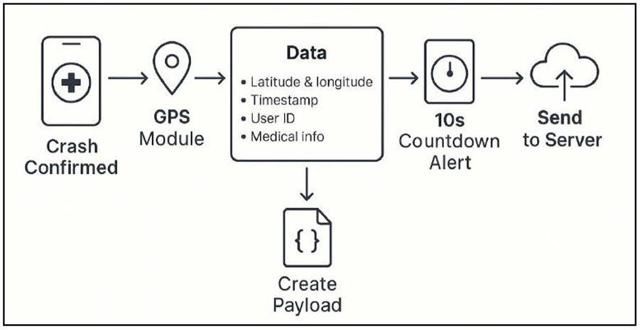 Whenacrashisdetected,thesystemimmediatelysprings into action. It first captures the exact location of the incident. To prevent false alarms, a brief cancellation period gives the user a chance to stop the alert if it was triggeredbymistake.Ifnocancellationoccurs,thesystem then sends out emergency notifications. These alerts, containing the precise location and crash details, are sent