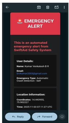To improve detection accuracy and minimize false positives, such as those caused by sudden braking, potholes, or accidental drops, the system incorporates sensor fusion. This involves integrating data from additionalsensorslikethegyroscopetodetectorientation changes and the GPS to monitor speed variations. A sudden and significant drop in speed combined with a high acceleration reading strengthens the confidence in identifying a genuine accident event. Once a potential accident is detected, Swift Aid implements a user verification protocol by triggering a short countdown timerduringwhichtheusercancancelthealertifitwasa false alarm. This feature addresses scenarios where noncritical sensor spikes occur, ensuring emergency responders are not dispatched unnecessarily. If the user fails to respond within this window, the system proceeds to automatically generate and dispatch a structured emergency alert. This alert contains crucial information including the user’s precise geographic coordinates, the timestamp of the incident, and any relevant sensor data that can assist responders in assessing the situation quickly. The alerts are sent simultaneously to predefined emergency contacts, nearby hospitals, and local authorities, significantly reducing the response time and increasingthechancesoftimelyassistance.