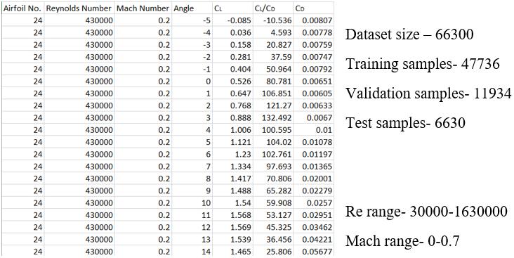 Aerodynamiccharacteristicsobtainedfrom JavaFoil arein text format. All the text files of various airfoils at different MachnumbersandReynoldsnumberarereadusingPython togenerateaconsolidatedfilewhichactsasmasterdataset fordevelopmentofthemodel.Fig3showsasnippetofthe masterdataset.