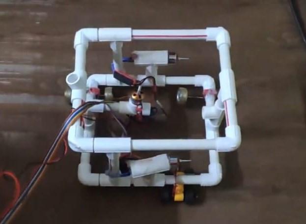Herewewillexplaintoyoutheworkingprocessofourrover. HerewehavetakenPVCpipesforourfoundation.AsPVC canhandlewaterverywellanditiscorrosionresistantso we have assembled all our main component of PVC foundation.NowwehavefourBLDCmotorsinwhichtwo motors will move in forward and reverse direction for movingroverintheforwardandbackwarddirection.Same motorswillbeusedforturningtheroverleftandrightby usingthemotorindifferent directions.Forexample,ifwe wanttoturnleftthenthemotorontheleftsidewillworkin the reverse direction and the motor on the right side will workintheforwarddirectionthentheroverwillturnleft. Now the third motor will be attached to the centre of the rover which will help it to go up and down, so when our work willoverwecanusethatmotortoreducethedepth andbringtheroveronthesurfaceandifwewanttodivein thewiththehelpofweightandmotorwecandivein.Now thelastBLDCmotorwillbeusedtonavigateontheground as it will be connected to the centre wheel and the rest 2 wheelswillbeforsupport.