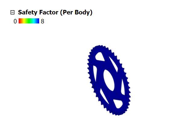 According to the selected final drive ratio of 4:1, the number of teeth of the driving sprocket is 11, and similarly,thedrivensprockethas44teeth.The520chains wereused.ThesprockethasbeendesignedonFusion360 considering the holes on the differential for mounting. Afterthedesign,thesprocketwasanalyzedonFusion360. ThematerialUsedfortheSprocketisAl7075t6.