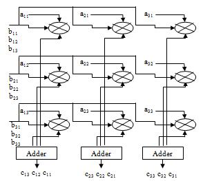 Forann×nmatrix–matrixmultiplication,theoperationis performedusing 2 n numberof multipliers, 2 n numberof registersand n n 2 numberofadders.Theregistersare used to store the partial product results. Each of the 2 n numberofmultipliershasoneinputfrommatrixBandthe otherinputisobtainedfromaparticularelementofmatrixA.