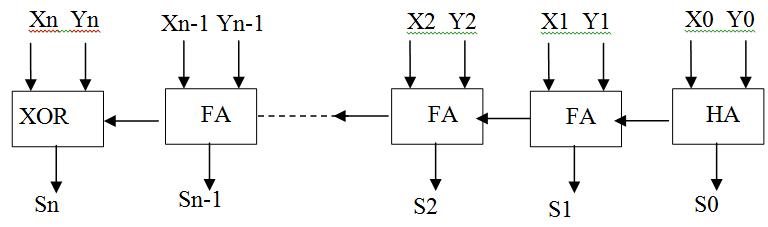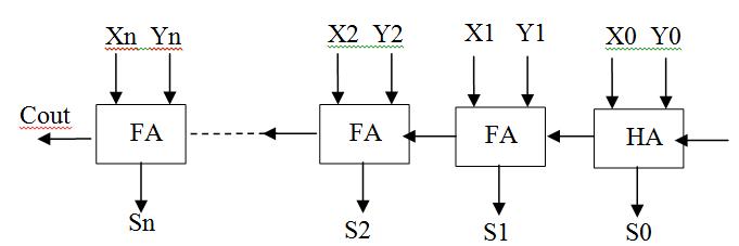correspondingbitsoftwobinarynumbersandcarrybitofthe previous adder. It produces sum bits and carry bit for the nextstageadder.Inthisaddermultiplecarryproducedby multipleaddersarerippled,i.e.carrybitproducedfroman adder works as one of the input for the adder in its succeedingstage.HencesometimesitisalsoknownasRipple CarryAdder(RCA).Generalizeddiagramofparalleladderis showninfigure3.