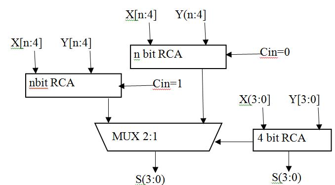 CarryselectadderusesmultiplexeralongwithRCAsinwhich thecarryisusedasaselectinputtochoosethecorrectoutput sum bits as well as carry bit. Due to this, it is called Carry selectadder.Inthisadder twoRCAsareusedtocalculatethe sum bits simultaneously for the same bits assuming two different carryinputsi.e.‘1’ and‘0’.Itistheresponsibilityof multiplexertochoosecorrectoutputbitsoutofthetwo,once the correct carry input is known to it. Multiplexer delayis included in this adder. Generalized figure of Carry select adderisshowninfigure3.9.Addersarethebasic building blocksofmostoftheALUs(Arithmeticlogicunits)usedin Digital signal processing and various other applications. Manytypesofaddersareavailableintoday’sscenarioand manymorearedevelopingdaybyday.HalfadderandFull