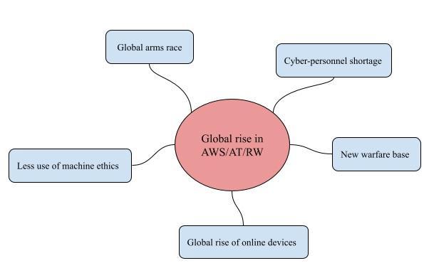 Fig-1:Summaryofthefivemajorreasonsofglobalrisein AutonomousWeaponsSystems(AWS),Autonomous Technology(AT),andRobotWeaponry(RW)(basedon theSectionIVofourstudy)[13]-[18]