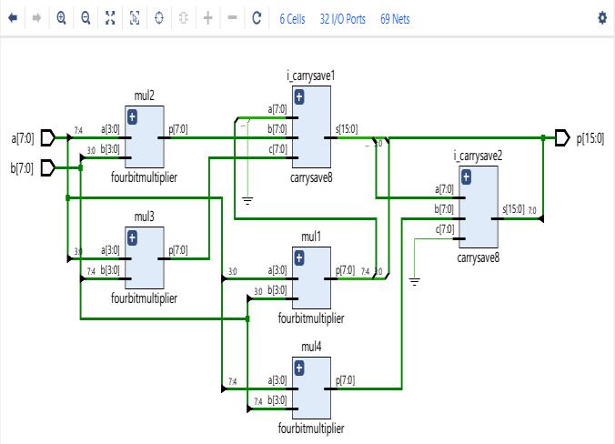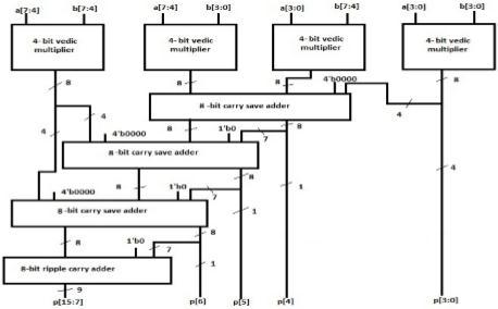 Fig.1showstheexisting8X8architecture.Forproposed8 X 8 Vedic multiplier presented in paper, architecture is developed as in Fig 2. The proposed method is realized using four 4 X 4 multiplier and adder blocks. Carry save addersareutilizedtoincreaseoverall speedandoptimize the area. In the Fig.2, a 16-bit output is generated by multiplying two 8-bit inputs. The adder blocks utilized in the design will not add a lot of latency because they are employed in carry save arrangements. This design has a larger than average transistor count. However, the improved performance is a compensation for the hardware complexity. As can be observed, CSA block inputs have zero padding. This is to ensure that all inputs totheCSAstagehaveuniformbitlengths.