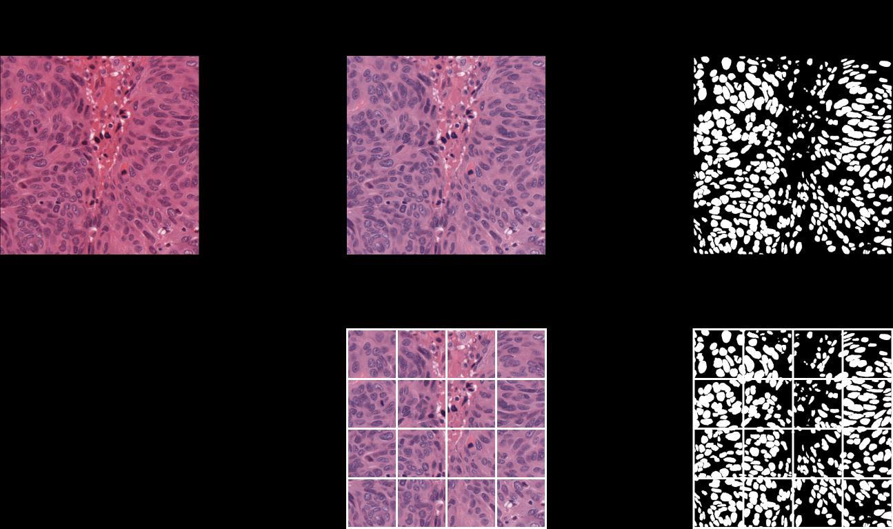 The most popular patch sizes have been 256x256 because they include more than enough contextual information from each nucleus' surroundings to extract meaningfulfeaturesforsegmentingthem.Asidefromthe massive amount of memory needed, feeding patches of thissizetothemodelassuresafasterpredictionandthe model hastolearna lotfewerparametersthanitwould if the original images of size 1000x1000 were used for training. Color normalization of the dataset before further processing has been a common method in past works of researchers. Impressive results were nonetheless obtained with color normalization and excessiveaugmentationapproacheswhichcompensated forstaininconsistenciesinthedataset.