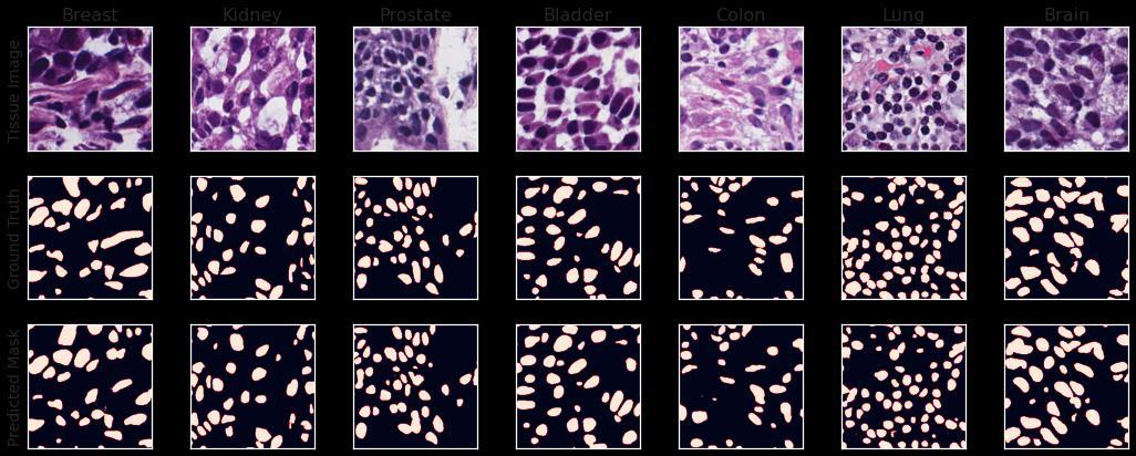 The dataset consists of 30 Hematoxylin and Eosin (H&E) stained tissue images with more than 21000 nuclear boundary annotations validated by a medical doctor.Thedatasetwasintroducedby(NeerajKumaret. al. 2017) who generated this dataset from The Cancer Genomic Atlas (TCGA) archive [16]. These 30 images contained H&E-stained images of 7 organs (Bladder, Brain, Breast, Colon, Kidney, Lung, and Prostate) which were used for training the model. The corresponding masks to these images were in the form of XML files, so theywerefirstconvertedtobinarymasksbeforefurther operations. Additionally, 14 images were provided to evaluate the model's performance and were utilized to validateandevaluatethemodel.