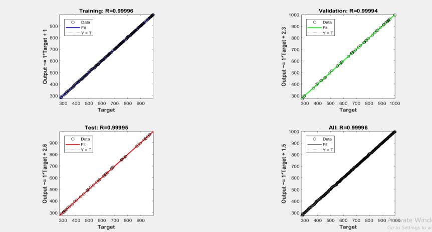 Fig.5.11showsthevariationoftheoutputversustargetforHCemissionwherethelimitofHCemissionwastakentill1000 PPM.Thetargetrepresentstheexperimentalvaluesandoutputrepresentsthepredictedvalueswhichwerepredictedbythe ANN.Fromtheaboveplotthevaluesofcorrelationcoefficient(R)fortraining,validationandteststagesforpredictingthe brakethermalefficiencyare0.9996,0.99994and0.99995respectively.Thevalueofcorrelationcoefficient(R)ineachstageis closerto1.Thisindicatesthepredictedresultsobtainedinthetraining,testandvalidationstagesarepositiveandstrongand thereexistsaperfectcorrelationbetweenthepredictedandexperimentalvalues.