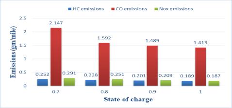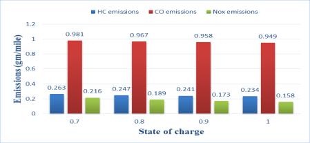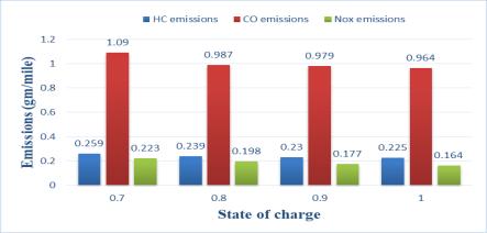 Itisknownthat aparallelhybridvehicledrawsitspropulsivepowerfrom2powersourcestopropelitself.Asthestateof chargedecreasesthecontributionofpowersuppliedfromthebatteryreducestoo.So,thevehicletendstodrawmorepower fromtheICenginewhichispetrol/gasolinedriven.Hencemorepowerisconsumedfrompetrol/gasolinethanbefore.Thusthis makesthevehicleemitmoreandmoreharmfulpollutants.That’swhythemagnitudeofpollutantemissionsincreaseswith decreaseinthestateofchargevaluesforaparticulardrivingcycle.