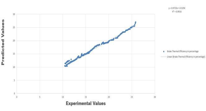Theabove plotrepresentsthevariationof predictedvaluesversus experimental valuesfor brakepower. Thecorrelation coefficientofthebrakepowershowsavalueof0.998whichisprettycloseto1.Thusitindicatestherelationbetweenthe predictedvaluesandExperimentalvaluesispositiveandstrongandtheywereclosertoeachother.AstheRvalueliescloserto 1whichmeansthereexistsaperfectcorrelationbetweenthepredictedandexperimentalvaluesinpredictingthebrakepower usingANN.Thereisariseinbrakepowervalueastheethanolblendpercentageincreasesandduetothat,thereoccursaslight deviationbetweentheexperimentalandpredictedvalues.