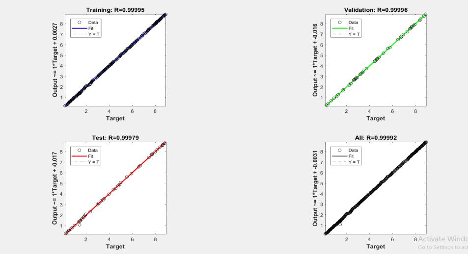 Fig.5.8showsthegraphicalvariationoftheoutputversustargetforbrakethermalefficiencyandthelimitofbrakethermal efficiencywastakenas26%.Fromtheaboveplotthevaluesofcorrelationcoefficient(R)fortraining,validationandteststages forpredictingthebrakethermalefficiencyare0.99993,0.9994and0.99983respectively.Thevalueofcorrelationcoefficient (R)ineachstageiscloserto1.It indicatesthepredictedresultsobtainedinthetraining,testandvalidationstagesarepositive andstrongandthereexists a perfectcorrelation betweenthepredictedand experimental values. Table5.3shownbelow representstheRMSEandRvaluesforbrakepower.