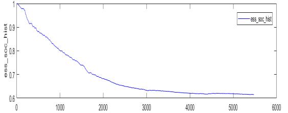 TheplotinFig.5.3showsthevariationofstateofchargewithrespecttotimeforaperiodof6000seconds(approx.100min).At thestartofvehicleoperation,thebatteryisfullychargedbutoncethevehiclestartstorun,thebatterygetstodischargeand thereisagradualfallinthestateofchargeaftersomeperiodoftime.Stateofchargeplotgivesawarningaboutthebattery withrespecttotime,asbatterychargingisavitalaspectinhybridelectricvehicles.