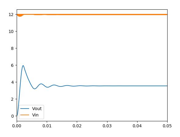 After setup the simulation (Appendix B) the the simulation results would be in the folder “C:\pythonpowerelectronics_simulation\Simulations\Buck_Converter” and the name of the file is “InputandOutputVoltages.png”.Fig. 2 shows the output and input voltage for D=30%. The stability time 10ms with overshooting<55%.