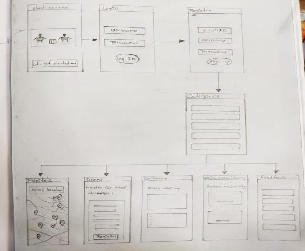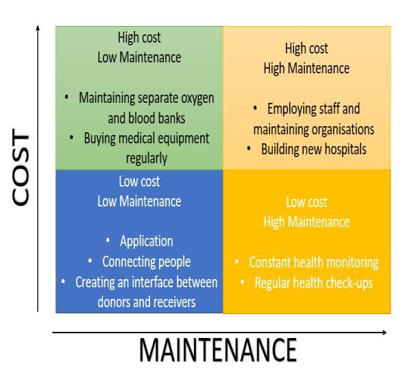 Finally,afterconstructing2*2matrixwehavecomeupwith an idea to design an application. This app includes a GPS systemtotrackavailabilityofbedsandmedicalequipments in nearby hospitals and also acts as an interface between donors and receivers i.e., the people who want to donate bloodormedicalequipmentsliketablets,oxygencylinders candirectlycontactwiththepeople whoareinneedof it, thiswillbeveryusefulforthepeoplewhoareinemergency and for the people, who have no one to look after them. Maintaining separate oxygen and medical equipments is morecostly.Buildingnewhospitalsandemployingstaffand maintaining organizations is also costly and it also needs highmaintenance.Ensuringconstanthealthmonitoringand regularhealthcheck-upsmaycostlessbutmaintenanceis highbecauseeachandeveryindividualmustbemonitored whichisdifficultbycommonsense.Sobyusinganappthe person who are in need of any medical facility like for example a patient needs blood donor of blood group b positivethenhecanposthisrequirementinthatappandthe personwiththatcorrespondingbloodgroupwhoisreadyto donatebloodcandirectlycontactthepersonwhoneedsit. Therefore,thisapp will be veryuseful forthepeople who requirehealthcareimmediatelyduringanemergency.