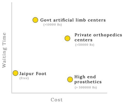 The Indian marketlacks thecost effective and efficient lower limb prosthetics that can reach the people in need. MostIndiansuse‘JaipurFoot’a low-costProsthetic maker that makes prosthetics from wood and is usually charges minimalamountwithnoprofitaspectandasapartofNGO. Butthisalternativeislesseffectivetouseasitcannotbeused in wet conditions and due to its low durability, it is not appropriate for prosthetics. The Jaipur Foot has no other outlets in India and the client has to go to Jaipur to get themselvesformeasurementandgetitscustomprosthetic.