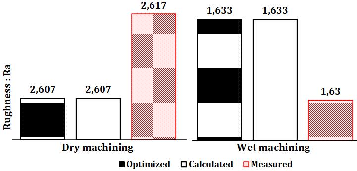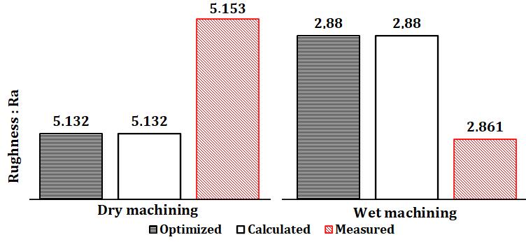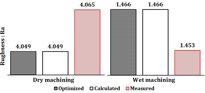 When machining is done wet machining, the optimized surfaceroughnessvalues(Ra=2.88μm)arealsoidenticalto thecalculatedsurfaceroughnessvalues(Ra=2.88μm).On the other hand, they are different from the values of the surface roughness measured after machining (Ra = 2.861 μm).ThereisaslightdifferencedenotedΔ(Δ=-0.019).