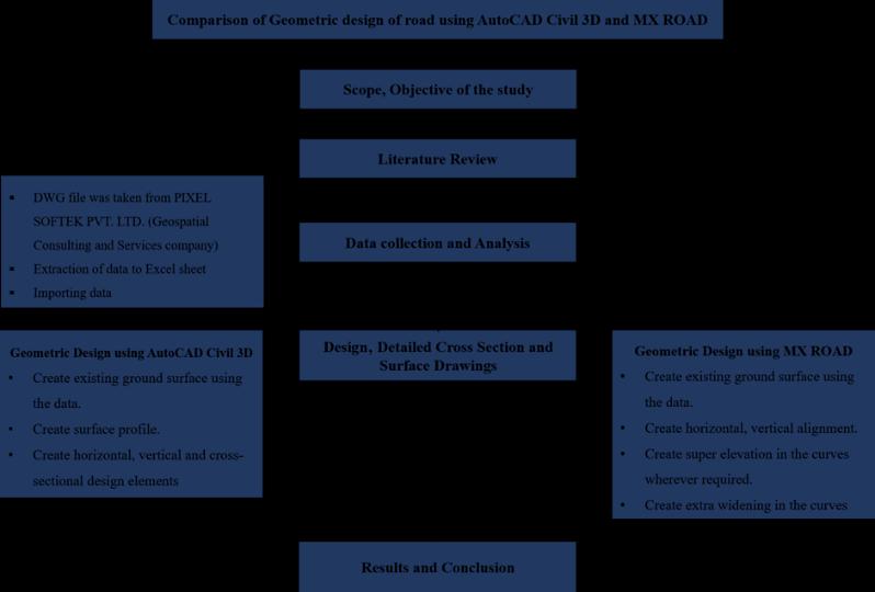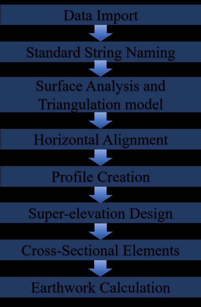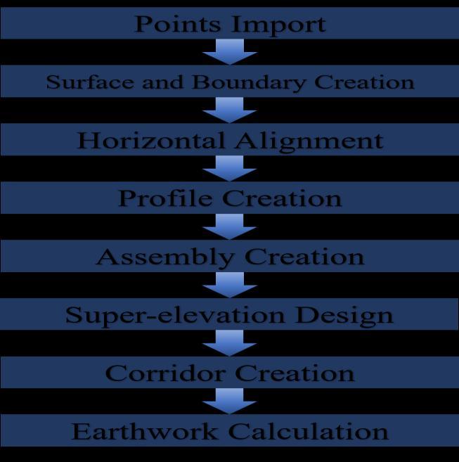 The work execution procedure is described in the flowchart Thestepsadoptedarewelldetailedinthefigure 1. The collected point data is then used for geometric design and analysis in the AutoCAD Civil 3D software and MXROADsoftware.