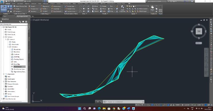 a. ImportsurveydatafromPNEZfile. b. Createexistingsurface c. MarkPolylineonexitingcenterlineofroad d. Designedaccordingtodesignproposedalignment in design-based criteria selected in civil 3d similarlymanuallycheckedfromIRC:38-1988for transition length for different speed, speed curve radii.