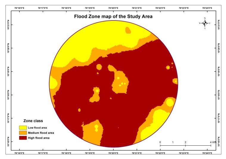 Thetotalstudyareaiscategorizedintothreezones,low flood, medium flood, and high flood according to flood intensity.4868.33Ha,whichis62%ofthetotalstudyarea washighlyaffected.Thefloodcovereda3to4kmdistance fromtheChalakudyRiver.Thewaterlevelreachedapeakof 9.05metersfromgroundlevel.Themostaffectedareasare thoseclosetotheriver.Thefloodedareaswithawaterlevel ofabout1to2.01comeundermediumfloodandit covers 1282.23haofthetotalarea,whichis16.33%.Thelowflood zonecovers 1701.70ha (21.67%) ofthestudyarea witha waterlevelof0.69to1meter.
