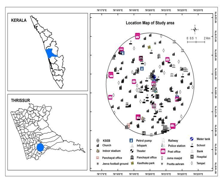 Chalakudyisamunicipaltown,withapopulationofabout 50,000. It is located in the southern end of the Thrissur districtinKerala,India.Theareaislocatedbetweena titude f t d a gitude f t Thestudyareaisabout78 km² around Chalakudy town The study has made use of various primary and secondary data. The Survey of India toposheet58B/71at1:50,000scaleandsatelliteimageswere used in this study. Land surface temperature data were collected from Landsat 8. Field surveys were made for collecting details about floods. ArcGIS and QGIS were the softwareused.