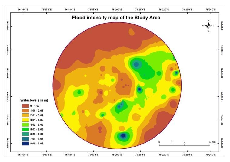 Thetotalstudyareaiscategorizedintothreezones,low flood, medium flood, and high flood according to flood intensity.4868.33Ha,whichis62%ofthetotalstudyarea washighlyaffected.Thefloodcovereda3to4kmdistance fromtheChalakudyRiver.Thewaterlevelreachedapeakof 9.05metersfromgroundlevel.Themostaffectedareasare thoseclosetotheriver.Thefloodedareaswithawaterlevel ofabout1to2.01comeundermediumfloodandit covers 1282.23haofthetotalarea,whichis16.33%.Thelowflood zone covers 1701.70 ha(21.67%) of the study area with a waterlevelof0.69to1meter.