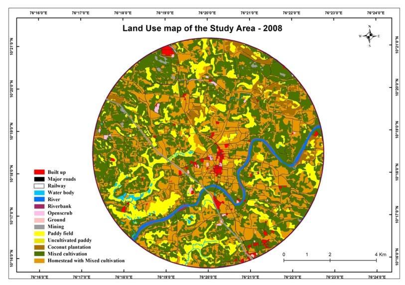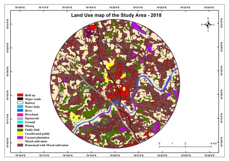 Whenitcomesto2018,themajorchangeshaveoccurredin the classes of mixed cultivation, homestead with mixed cultivation,paddyfield,majorroads,andbuilt.Thechange thatsoccurredinthemixedcultivationandpaddyfieldsis noticeable.In2008theareacoveringmixedcultivationwas about3122.3hawhichthendeclinedto1852.68hain2018. Paddy fields covered 1132.7ha of the total area in 2008 whileitisonly848.16hain2018.Thisdeclineisassociated withtheconversionofpaddyfieldsintococonutplantations andmixedcultivation.Theincreasedpopulationtriggered theconstructionofhomesteadsinvegetatedareas.Thereisa remarkableincreaseinthecontributionofhomesteadswith mixed cultivation in 2018. HMC covered 2604.7ha of the total area in 2008 which then increased to 3828.77ha in 2018. In 2008 the contribution of built-ups was only 117.89hawhichis1.50%ofthetotalareawhileitisabout 338.42ha(4.31%)in2018. Thesebuilt-upsareconcentrated in Chalakudy town In 2008 the area used by roads was 274.75ha(3.46%)whichincreasedto455.34ha(5.80%)in 2018.Anothernoticeablechangeisseeninthe number of water bodies. The 83.38ha of water bodies reduced to 52.33hain2018.