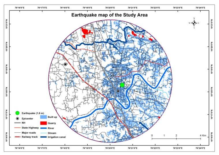 On 18 September 2007 at latitude 10.30 and longitude 76.34, there was an earthquake of magnitude 1.6. The distancesfrom epicenterstothespotare6kmand4.8km. According to the Richter scale, 1.6 comes under micro earthquake.Therearetwoepicentersinthestudyarea.