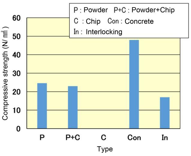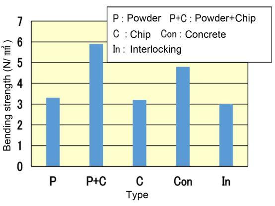 According to quality standards of interlocking blocks forpedestriansmentionedbytheJapanInterlockingBlock Pavement Engineering Association (JIPEA), the bending strength must be 3.0 N/mm2 or more. Chart 1 shows the bending strength of all bamboo block types, concrete, and interlocking blocks. It was confirmed that the bending strength of the bamboo chip block (C) generated by pulverizingwastebamboosatisfiesthequalitystandardof 3.0N/mm2 ormoreforinterlockingblocksforpedestrians (In)andwasalsoconfirmedtohavesufficientcompressive strength. In addition, it was found that the bending strengthofthebamboofiberblock(P+C)isabouttwiceas strong as the quality standard of the pedestrian interlockingblock(In).
