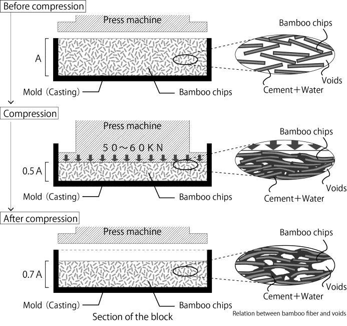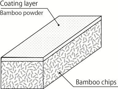 The manufactured bamboo fiber block consists of two layers: the upper layer is a coating made of powdered bamboo fibers that have a fiber length of 30 mm or less with cement. The lower layer is made of bamboo chips which have a fiber length of 30 mm or more and 100 mm orlesswithcement.(Fig.7).