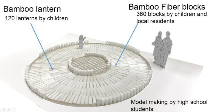 In addition, bamboo fiber blocks need to be replaced due to damage. However, they can be easily replaced by residentsbecausetheyarelightweightandeasytohandle. Moreover,damagedblockscanbeeasilybrokenintopieces and turned back into bamboo fibers and returned to nature. The eco-cycles of abandoned bamboo would also makeuseofacommunitydevelopmenttool.