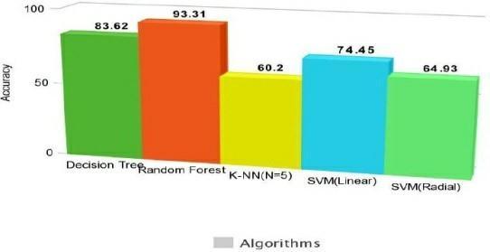 TheaccuraciesachievedbyapplyingthealgorithmsDecision Tree,RandomForest,K-NN,SVM(Linear),SVM(Radial),SVMRFE(Recursive Feature Elimination) on the preprocessed diabetic dataset are 83.62%, 93.31%, 60.2%, 74.45%, 64.93%,74.45%respectivelyshowninthefigure2.