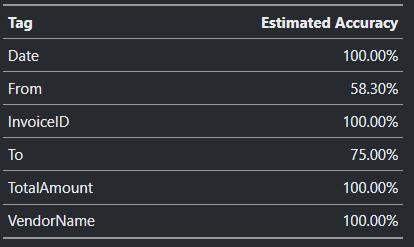 The above table gives a proper representation of the typesof invoices trained and accuracy obtained after extraction of all the possible fields from the document.