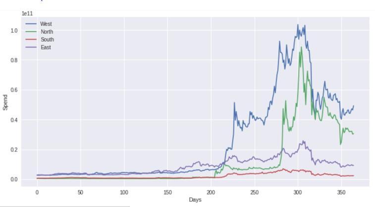 Theabovegraphshowsananalysisofspendineveryzone before and after the Covid Pandemic.Days after 200 showsthe peroid when the Covid Pandemic was in better control and the days starting from 0 shows the period when the pandemic was at its peak.
