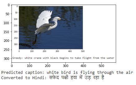 EachoutputispresentedinEnglishandconvertedintoHindi language.There’sanaudioassociatedwitheachthatspeaks out the result which is done using gTTS (Google Text to Speech) library as shown in the first output. The BLEU (Bilingual Evaluation Understudy) which is a metric to compare the output with the predicted one [8].For calculatingtheBleuscorewehaveusedtheNLTKlibraryof python.ForourmodelwehaveachievedtheBleuscoreof 0.5625.