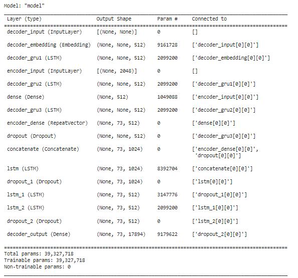 The most actively used decoder architecture is LSTM (Long Short Term Memory). On the other hand we have implemented it with GRU (Gated Recurrent Unit) because thereisn’tmuchdifferencebetweenLSTMandGRUbutthe lateronedoesn’thavethecellstatebutmakesuseofhidden statetotransfertheinformation.