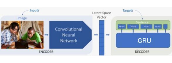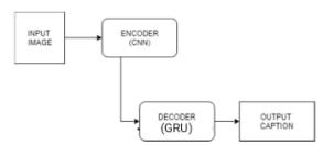 ThemostwidelyacceptedarchitectureisEncoder-Decoder architecture.InourcasetheencoderpartisConvolutional Neural Network (CNN) and the decoder part is Grated Recurrent Network (GRU) which is a type of Recurrent NeuralNetwork(RNN).Thegenericmodelrepresentationof thearchitectureisshownbelow.