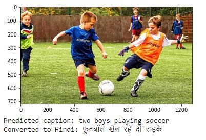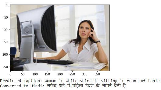 Abstract -Theimageswhenpresentedtohumanscaneasily identify the objects, relationships among the objects of the givenimage.Similarly,ImagecaptioningisthemodelintheAI sector, wherethe image is sent as input, and then the objects, relationship between the objects are generated as captions. The model is based on encoder decoder architecture which is trained on flickr30k dataset. This paper describes the deep insights of deep learning techniques used for caption generationwithconvolutionalneuralnetworksandrecurrent neural networks. The results are then translated into Hindi. The model is prepared with focus to help visually impaired people with voice assistant functionality.