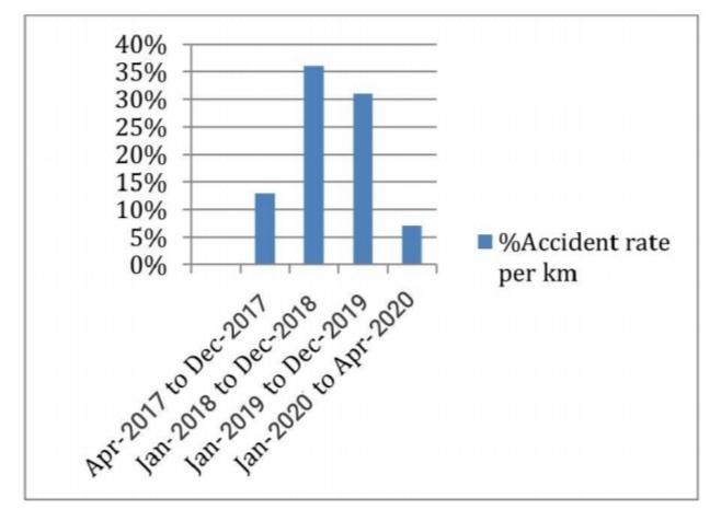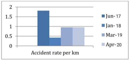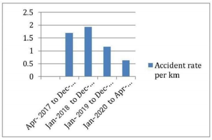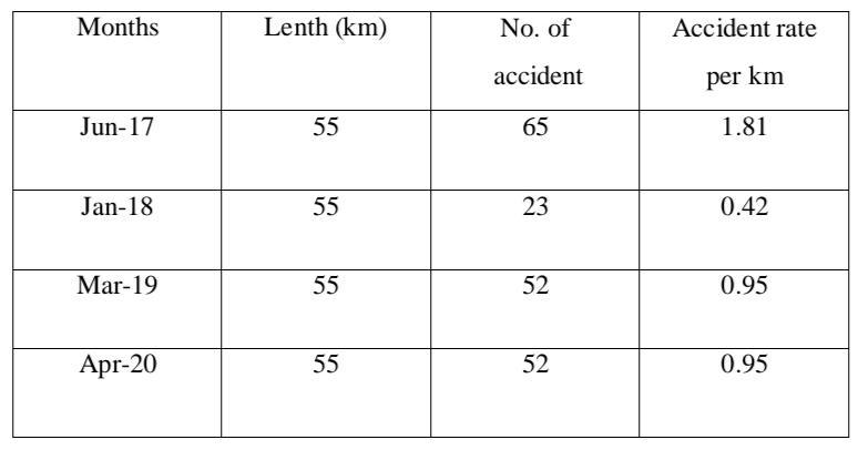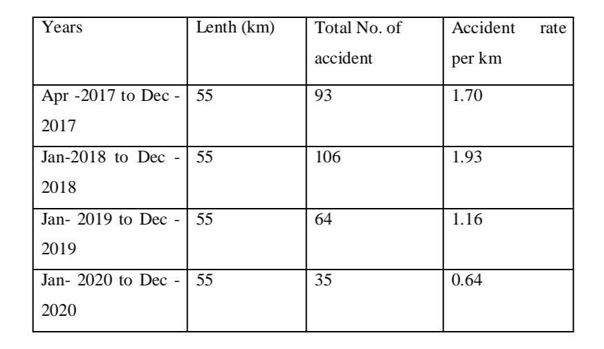 Accordingly, the number of accidents of all categories per km of each highway and street classification is used to indicate the total accident hazard. R=A/L Where L is the length of the control section in kilometres, A is the total numberofaccidentsthatoccurredduringtheyear,andRis the overall accident rate per km. Accident rate from April 2017toApril2020,allaccidentsincluded(Fatal,Grievous, Minor)