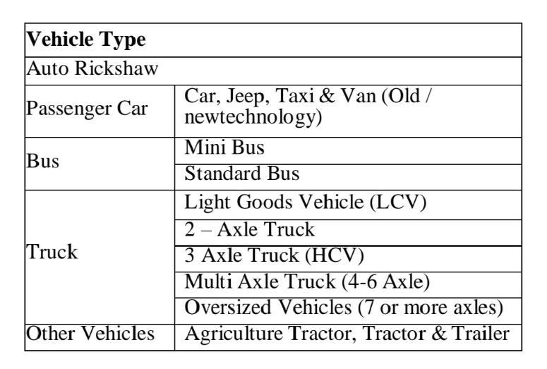 Understanding the modal split and traffic flow pattern on a roadway is the goal of a Classified Traffic Volume Count.Theconcessionaireoftheprojecthighwaydelivered theClassifiedTrafficVolumeCountsurveybasedonactual traffic data collected at toll plaza sites based on monthly data. The vehicles can be roughly divided into two categories: those that move quickly and are propelled by motors and those that move slowly and are propelled by humanpower.Toll-exemptvehiclesarecountedseparately and the vehicle groups are further divided to capture the toll-able vehicle classifications. Table lists the specific vehiclecategorizationsystemaccordingtoIRC:64-1990.