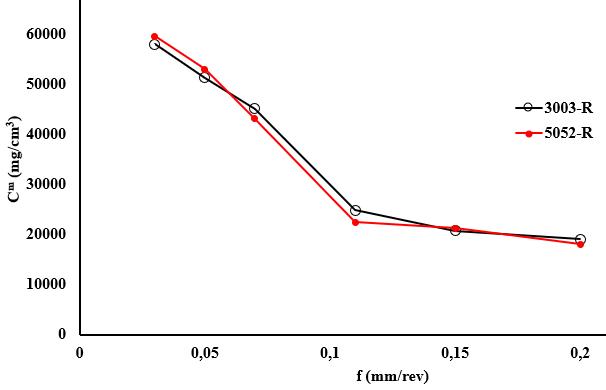 Formulas6and 7 represent experimental models thatfollowalogarithmicformwithanR2statisticof0.94. These formulae could be used to evaluate the mass concentrationofmetalparticles,dependingontheadvance inmachiningrecycledalloys3003-Rand5052-R.