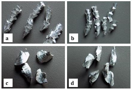 Fig-5: Morphologyofalloychips:a,b)Chipsofalloys3003-R and 5052-R, f = 0.03 to 0.2 mm/rev; c, d) Chips of alloys 3003-Rand5052-R,f=0. 7to0.2mm/rev
