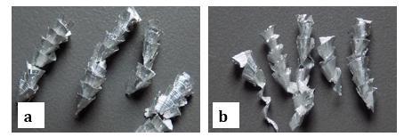 Fig-6: Alloy chip morphology, f=0.03 mm/rev (a) Alloy 3003-Rchips;(b)ChipsofalloyA356-T0