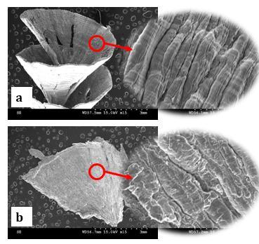 At a constant cutting rate of 100 m/min, chip segmentation was made and observed under a scanning electron microscope. Figure 8 shows an extract of the segmentation of the alloy chips, for the advance 0.03 mm/rev(Figure7a),fortheadvance0.2(Figure7b). The morphologyofchipsanditssegmentationdependsonthe properties of the alloys, but also on the parameters and cuttingconditions.Therefore,foragivenalloy,achangein thesedatacanmodifythemorphologyandsegmentationof thechips,Xieandal[26].Inthisfigure,theimageontheleft showsthechipsampledandmagnified15times.Theimage on the right, a selected part of the chip, shows the segmentationofthechip,magnifiedto500times.